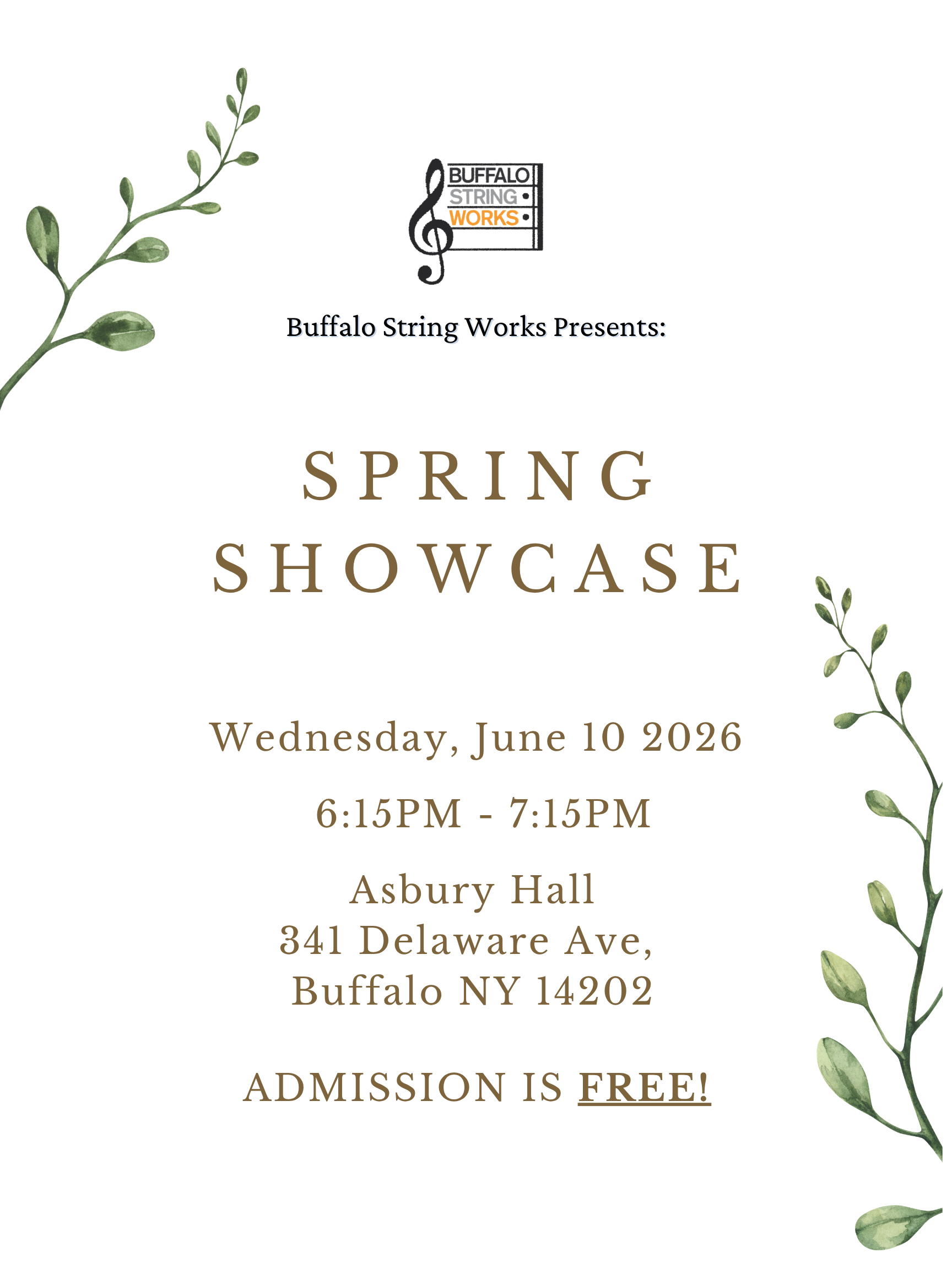 Join us for Buffalo String Works’ 2026 Spring Showcase on June 10 2026 at Asbury Hall (341 Delaware Ave, Buffalo NY 14202) for a vibrant celebration of our students’ dedication and musical growth throughout the year.